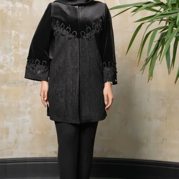مانتو مجلسی مزونی مشکی ژاکارد و مخمل سنگ دوزی شده